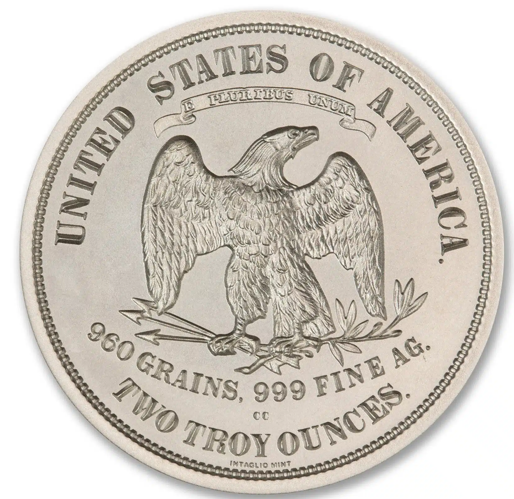 The 1873 cc trade dollar tribute round was struck by the Intaglio Mint in 2 troy oz of .999 fine silver with a silky satin finish. Intaglio is known for its beautiful renditions of late 18th- and early 19th-century US coins. The ultra-high relief and shimmering satin finish enhance many of the intricate details that often go unnoticed in smaller coins.