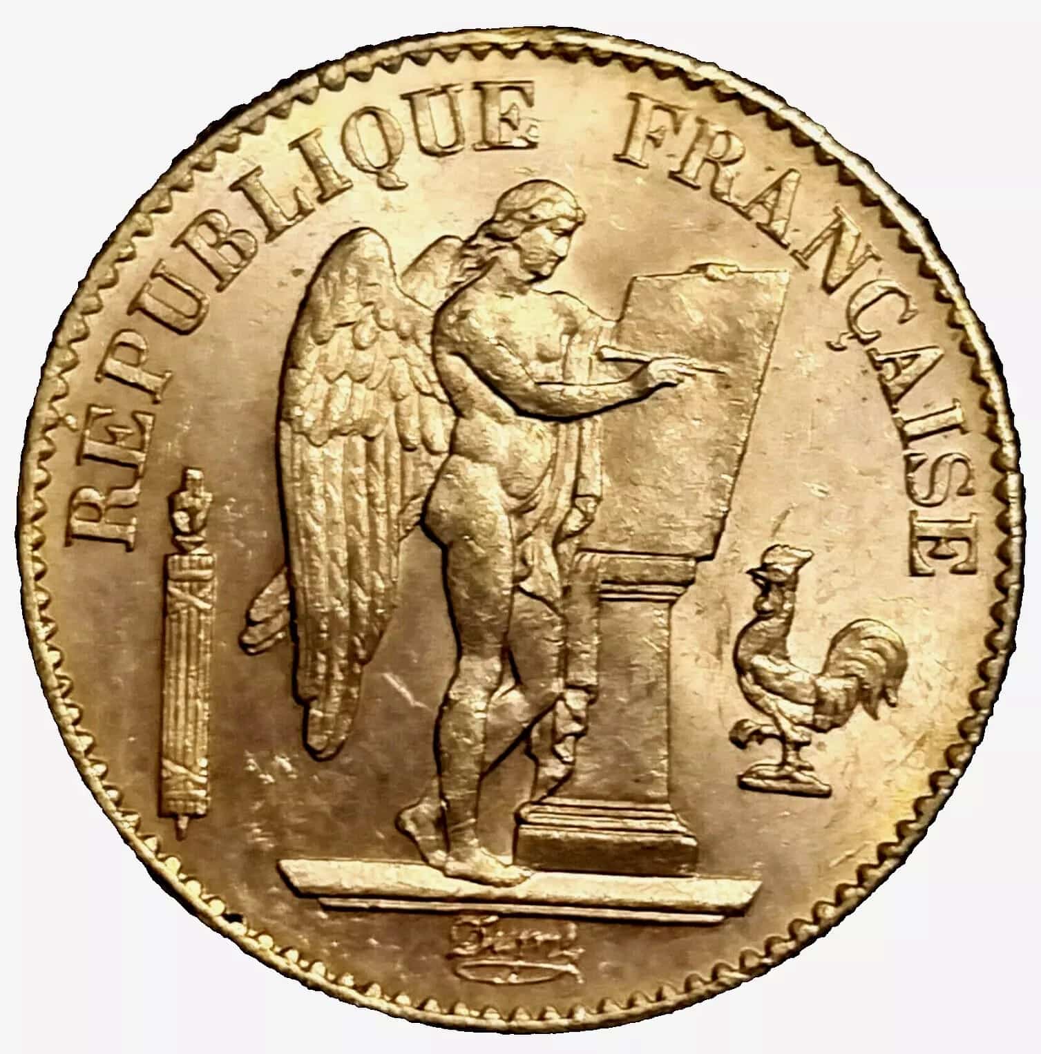 The obverse side of the coin features an image of a guardian angel, also known as “The Genius”. She’s depicted near a column writing on the French constitution as a gallic rooster looks on.