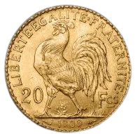 The featured 1909 Marianne gold rooster is brilliant, uncirculated, and in excellent condition. Keep in mind these coins were struck over 120 years ago, and they all contain “bag marks,” as they were transported in canvas bags.