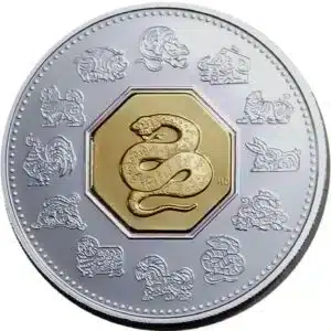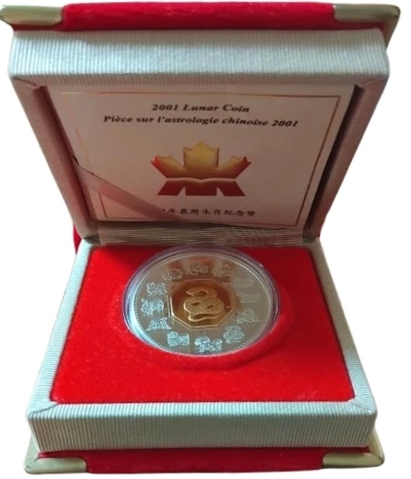 The 2001 Canadian lunar snake is proof struck in 1 troy ounce of .925 silver gilded in 24 karat gold. Masterfully struck with a beautiful luster, it brings out many of the intricate details that would often go unnoticed.