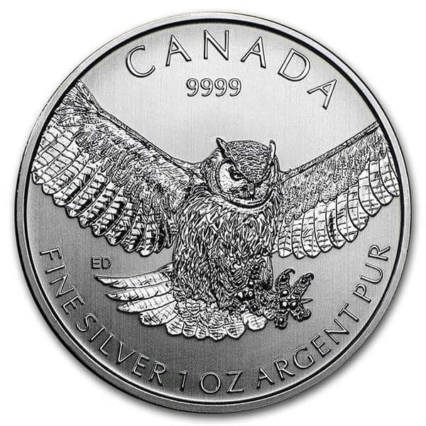 The 2015 Great Horned Owl is struck in 1 troy oz of .9999 fine silver. The obverse is graced with an effigy of Queen Elizabeth II. The reverse features a close-up photo of the predator in flight.