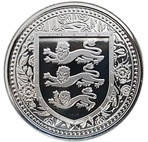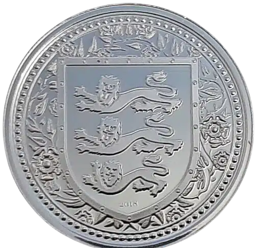 The obverse side of the coin is graced with the fifth effigy of Queen Elizabeth II. The reverse features the heraldic shield with three lions in passant guard. The shield is currently displayed on the present-day royal arms quartered shield.