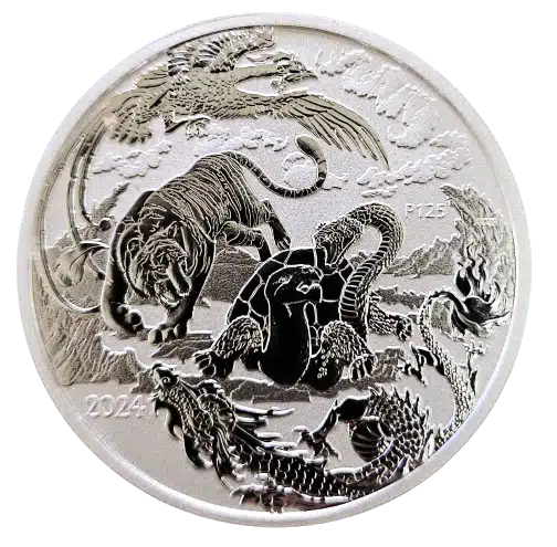 This coin is a tribute to ancient Chinese cosmology, in which the four guardians stand for the four cardinal directions (north, south, east, and west) and are associated with a season (summer, autumn, winter, and spring) and one of the ‘five elements’ (wood, fire, earth, metal, and water).