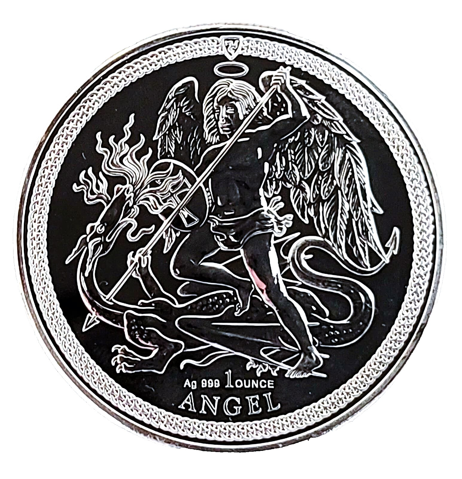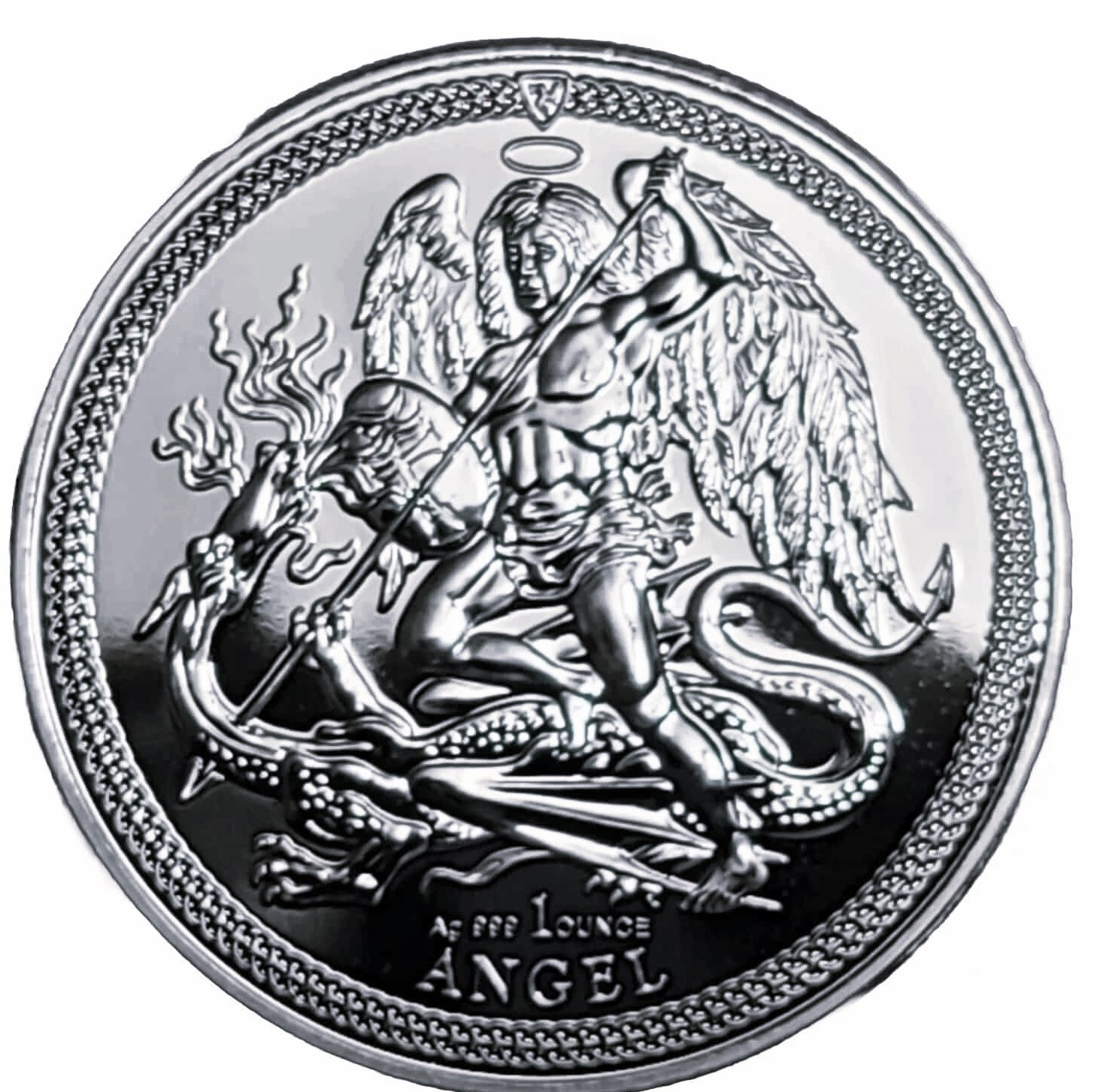 The featured 2024 Angel coin was issued by the Isle of Man and struck by the Tower mint. It contains 1 troy oz of .999 fine silver with a proof-like finish.