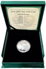 The 2025 Burundi Year of the Snake is a proof struck in 2 Troy oz of.999 fine silver. The obverse is adorned with the Burundi coat of arms, surrounded by 12 lunar animals. With the coin’s tilt, a holographic element along the edge emits vibrant colors.