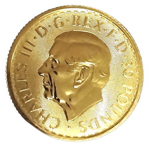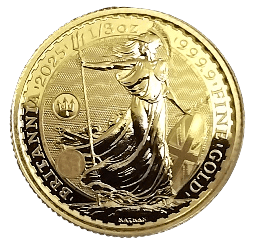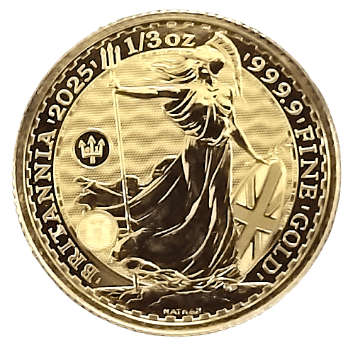 The new 2025 Britannia is struck in 1/3 oz .9999 pure gold by the Royal Mint. The obverse is graced with the first official portrait of King Charles III, designed by artist Martin Jennings.