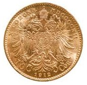The gold Corona was issued from 1892 to 1916 in three denominations: the 10, the 20, and the 100. Due to its popularity, restrikes of the gold Corona were issued with the date 1912, commemorating the longest-reigning emperor in Europe, Franz Joseph.