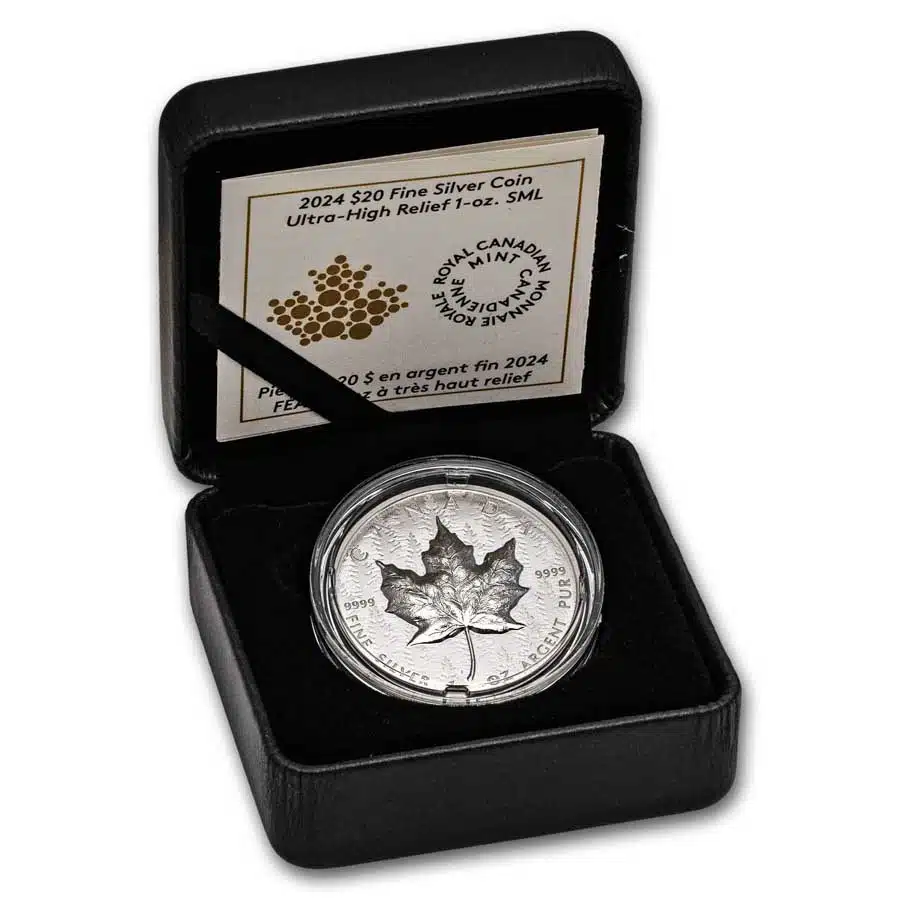 The reverse side features Walter Ott’s iconic sugar maple leaf set against the “heart of the forest” backfield. Masterfully Struck, a simple tilt of the coin will leave you mesmerized. Direct from the mint, the 2024 Maple Leaf arrives encapsulated and housed in the Royal Canadian Mint signature display box along with a numbered certificate of authenticity.