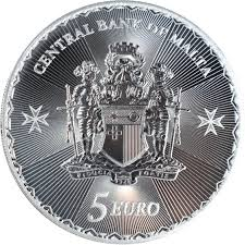 The cross consists of four V-shaped patterns converging at the center, resulting in a unique 8-pointed cross. The eight points represent the virtues that the knights would abide by. The reverse features an image of the cross, with Malta’s coat of arms on the obverse.