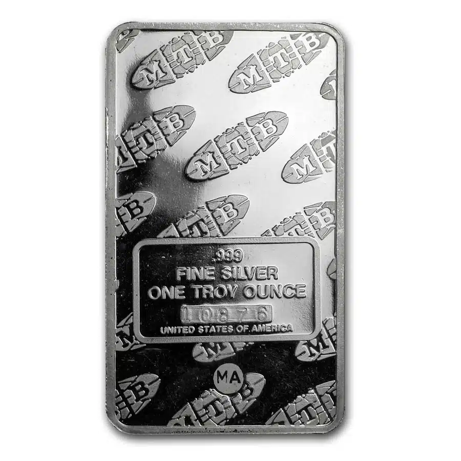 The featured 1 oz silver bar was struck in .999 fine silver. The obverse features a full-length depiction of Lady Liberty. The reverse features a repeating pattern of the MTB logo along with a unique serial number and coveted “MA” privy mark.