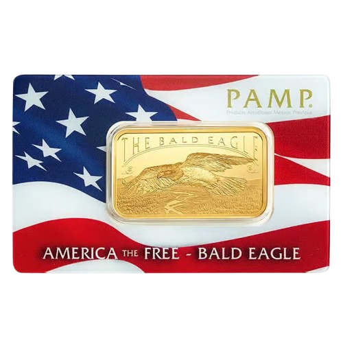 The reverse side of the bar features the PAMP Suisse logo, purity, weight, and unique serial number. A spectacular image of the majestic bald eagle is struck on the obverse.